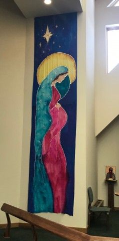 Katie Romanoski and her grandchildren prepared this banner of Mary for Christmas at Lord of the Mountains. Mary who invites us to join with her in giving birth to, raising, mourning, and—eventually—following Jesus Christ our Lord. Luke portrays her in this startling role: one that shakes up the way we’ve been brought up to think of “Blessed Mary, Mother of God.” He calls us to stop worshipping from afar and begin living as she lived.